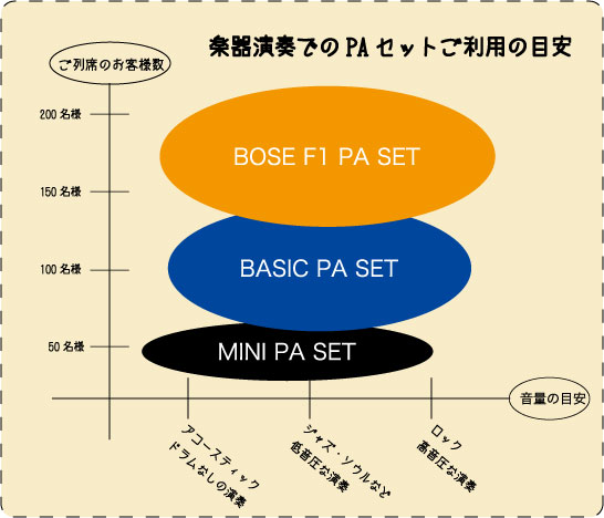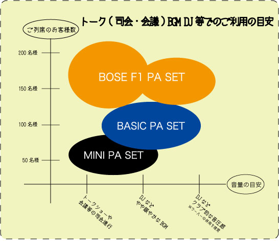| 楽器演奏の場合: アコースティックライブ・ジャズ系の落ち着いた雰囲気の演奏向け DJイベントの場合: 「やや煩いBGM」程度 |